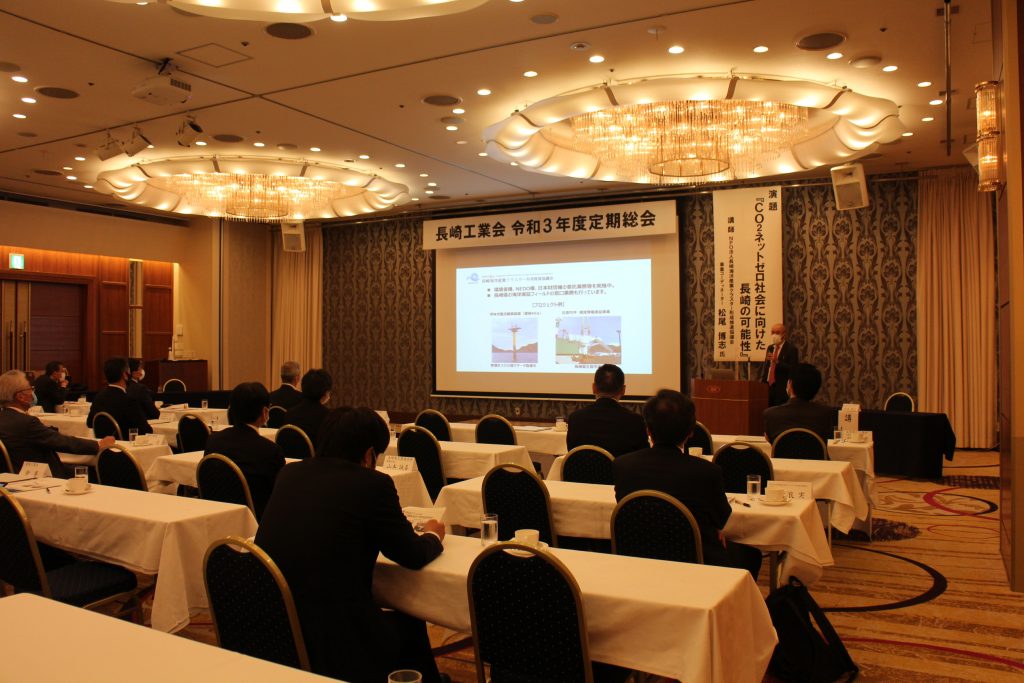 長崎工業会(会長・梶原正雄)は、令和3年度定期総会・講演会を市内ホテルにて開催し、来賓・会員あわせて50人が出席した。