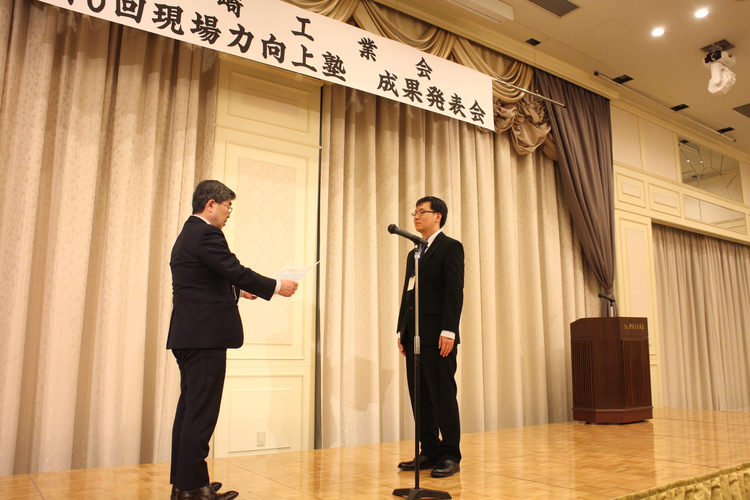 ▼最優秀賞の表彰を受ける三菱長崎機工㈱の佐々木さん
